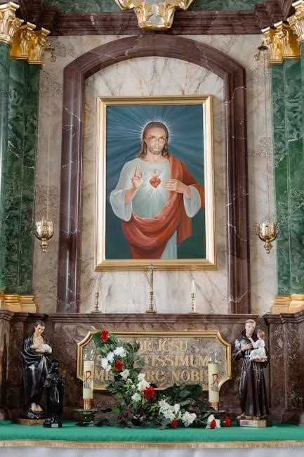 PDF resources highlight the Sacred Heart as a symbol of divine love and mercy, deeply rooted in Catholic theology and Eucharistic communion.